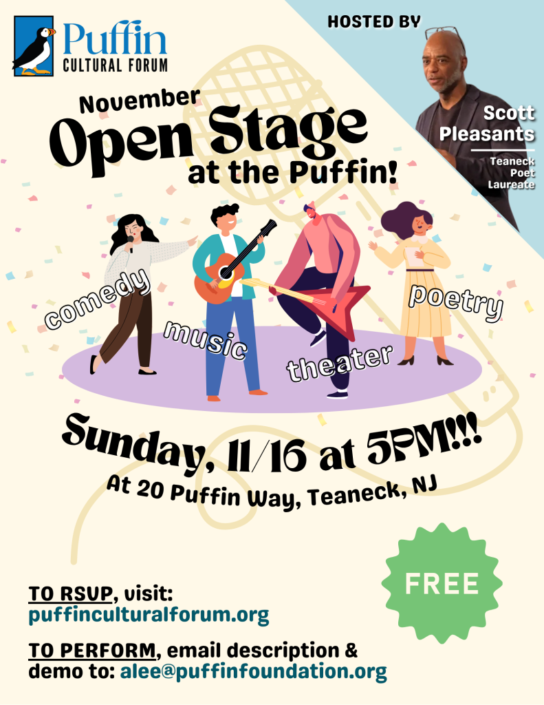 The Forum invites YOU to take the stage! We welcome performers from all disciplines—music, poetry, dance, theater, comedy, and more. Join us for a FREE celebration of community, arts, and culture, hosted by Teaneck’s very own Poet Laureate, Scott Pleasants! Snacks and refreshments will be served.