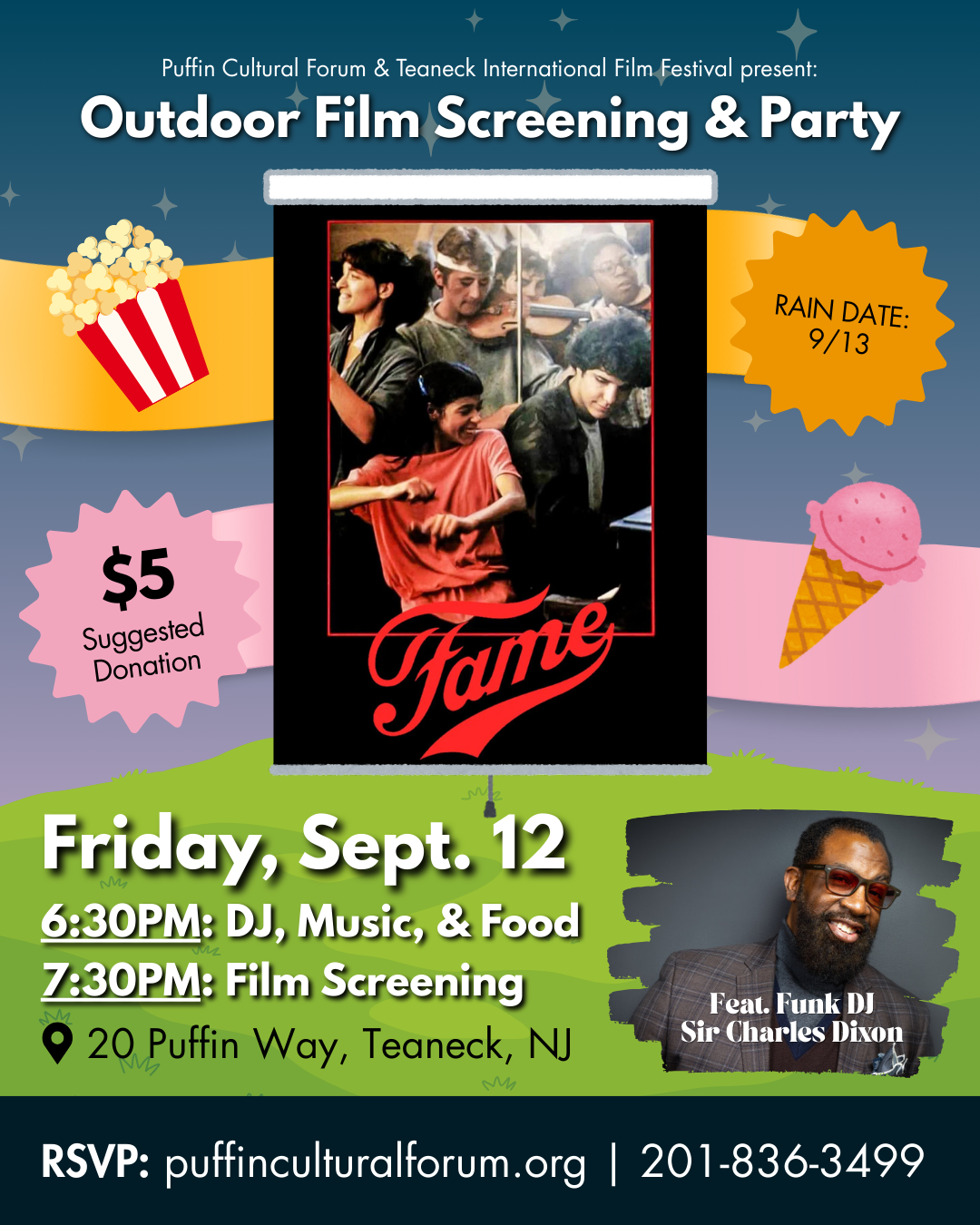 The Puffin Cultural Forum and Teaneck International Film Festival welcome you to our September outdoor party and film screening to celebrate the return of the school year! Mark your calendars and reserve your seats. Music, food, ice cream, and popcorn from our brand new popcorn machine will be served!