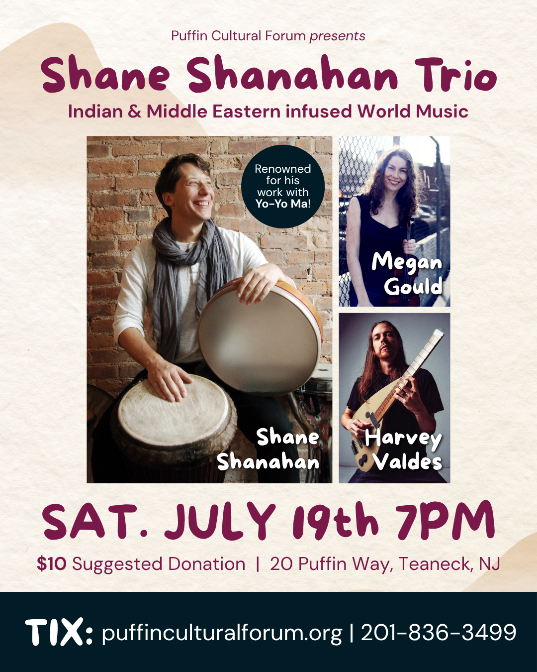 Shane Shanahan, renowned for his decades of work with Yo-Yo Ma’s Silkroad Ensemble, brings his mesmerizing percussion artistry to the Puffin. His powerhouse world music trio features Harvey Valdes on Arabic Oud and Electric Guitar, and Megan Gould on Violin.